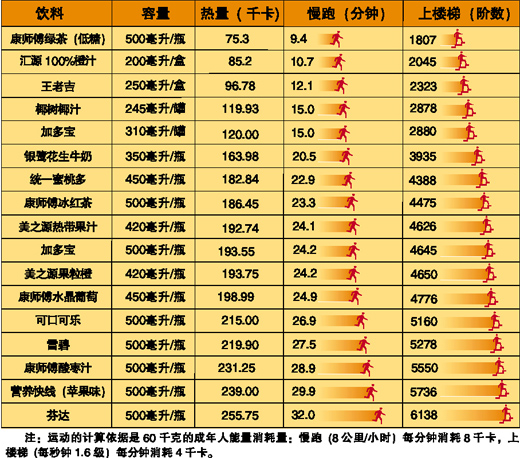 近日,“果壳网”发表了营养与食品安全硕士阮光锋的一篇文章,其中“让我们来算算喝完饮料你要做多少运动”的图表在微博热传。我们参考一下,喝下手里的一瓶饮料,需要做多少运动才能消耗?