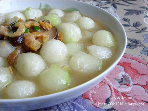 做法:香菇水发、洗净;冬瓜去皮洗净,用钢球勺挖成圆球待用;姜洗净切丝;将锅内放入适量植物油烧热,下姜丝煸炒出香味,入香菇继续煸炒数分钟后,倒入适量鸡汤煮开;将冬瓜球下锅烧至熟时,用水淀粉勾芡,翻炒几下放入味精,淋上香油,即可出锅。