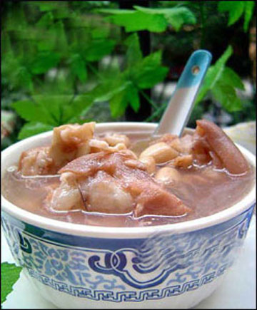 做法:将猪蹄洗净开边,与苡仁同放入锅内,加入少量水、料酒、姜、盐等,先用大火煮开后,改用文火慢煮两个小时左右,猪蹄烂熟即可。