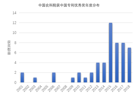 2018年,中国农科院共获得中国专利奖57项,其中包括中国专利金奖3项,即生物技术研究所的“携带编码杀虫蛋白质融合基因的表达载体及其转基因植物”(ZL 95119563.8)、哈尔滨兽医研究所的“马传染性贫血病驴白细胞弱毒株及其培育方法”(ZL 96103323.1)和农业环境与可持续发展研究所的“甘薯吸收根-块根功能分离栽培方法”(ZL 200720190763.2);中国专利银奖1项,即兰州兽医研究所的“牛羊等反刍动物口蹄疫O、A型双价灭活疫苗”(ZL 03103300.8);中国专利优秀奖53项。据统计,中国农科院获奖专利数量占农业领域全国获奖总数的60%以上。