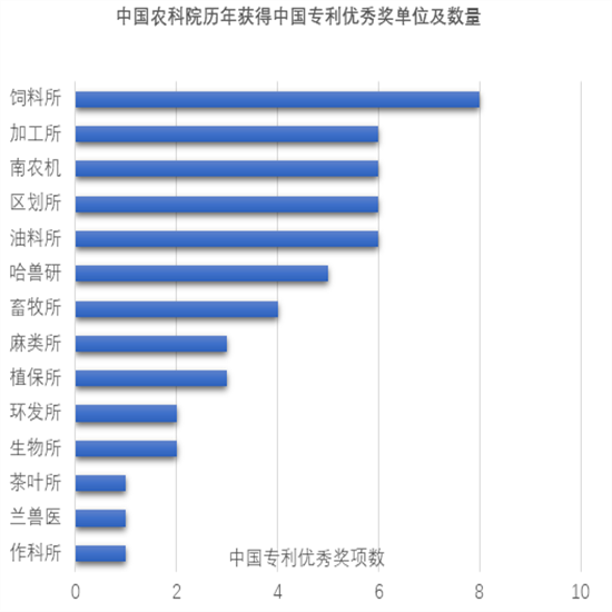 近些年,中国农科院每年荣获中国专利奖数量基本稳定在8项左右,共有14个研究所获得过中国专利奖,其中饲料研究所获得专利优秀奖数量最多。