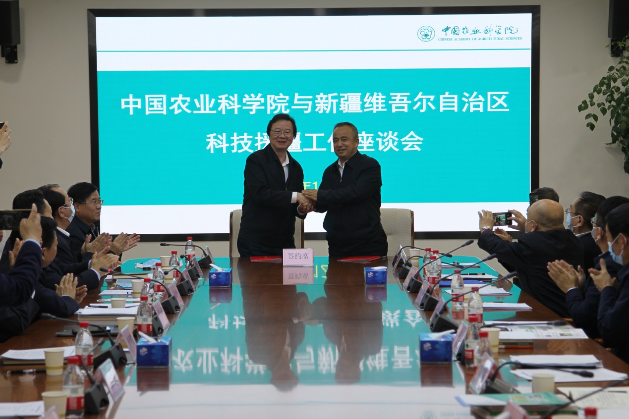 会上,双方签署了《中国农业科学院 新疆维吾尔自治区人民政府农业科技合作协议》。协议提出了“优势互补、互利共赢、友好协商、共同发展”的合作原则,确定了棉花、畜牧业、林果业、种业、加工业、绿色发展、高标准农田建设、人居环境整治、农业农村信息化、人才培养等十大领域的合作内容,并制定了成立合作领导小组等保障机制。
