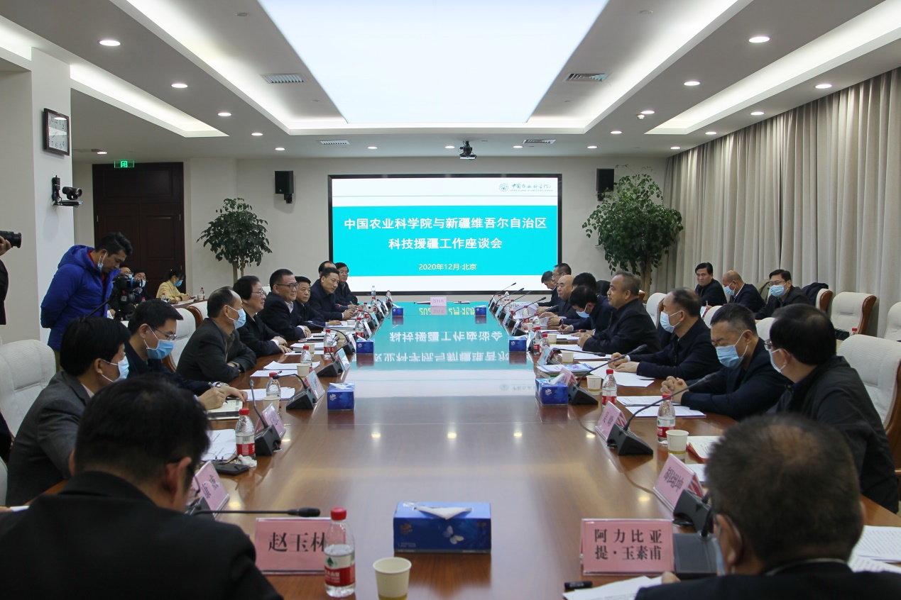 会议学习了十九届五中全会精神和第三次中央新疆工作座谈会精神,总结交流了中国农科院过去科技援疆的措施与成效,并研究部署下一步工作。中国农科院坚决扛起科技援疆政治责任,立足发挥新疆区位优势,坚持新发展理念,坚持需求导向和结果导向,助力新疆培育壮大特色优势产业,会上与新疆商定12项科技援疆举措:为新疆编制农业产业兴旺和乡村振兴规划以及举办新疆乡村振兴高端论坛提供智力支持;合作培育新疆农业科技人才队伍;科技支撑新疆高标准农田建设;支撑推进新疆农业农村信息化提速;科技支撑牛结节病等重大动植物疫病防控;开展新疆棉花、葡萄、红枣、褐牛等全产业链绿色技术集成与示范;科技助力新疆美丽家园建设;共建新疆县域农业科技成果示范转化基地;共同建设中国农业科学院西部中心;共同建设昌吉国家农业科技园;共建全国农业科技成果转化转移西部分中心;科技支撑莎车县等乡村振兴示范县建设。
