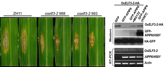 Rice blast, which is caused by the fungal pathogen Magnaporthe oryzae, significantly reduces rice yield in most rice-growing areas. Although many studies have shown that the ubiquitin E3 ligases play an important role in the regulation of blast resistance in rice, the function of their substrates in immune responses is still not fully understood. Recently, researchers at State Key Laboratory for Biology of Plant Diseases and Insect Pests, Institute of Plant Protection (IPP), CAAS, have published a research paper about E3 ligase APIP6 substrate protein OsELF3-2 in rice.