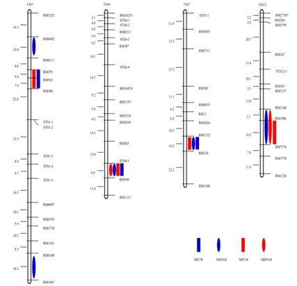 Genetic linkage map of putative QTLs for flag leaf width and cholorphyll content at different growth stages in rice.