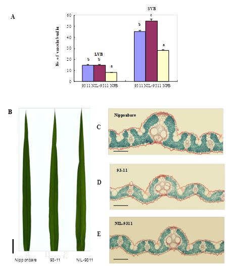 Comparison Morphology and Cross-Sections of Flag Leaves. (A) Characterization of large vascular bundle (LVB) and small vascular bundle (SVB) number of 93-11, NIL-9311, and NPB. Each column represents mean ± SD. Columns with different letters were significantly different (P < 0.01, least significant difference test). (B) Flag leave morphology of Nipponbare, 93-11, and NIL-9311 (bar=2.5cm). (C–E) Cross-sections of flag leaves stained with Safranin O and Fastgreen FCF in Nipponbare, 93-11, and NIL-9311. Bar=100μm.
