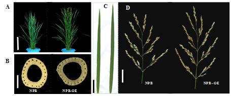 Transgenic Nipponbare Plant (NPB-OE). (A) Plant morphology (bar=30cm). (B) The culm cross-section of the fourth internode (bar=2mm). (C) Leaf shape (bar=5cm). (D) Panicle (bar=4cm) of Nipponbare (NPB) and overexpression Niponbare (NPB-OE).