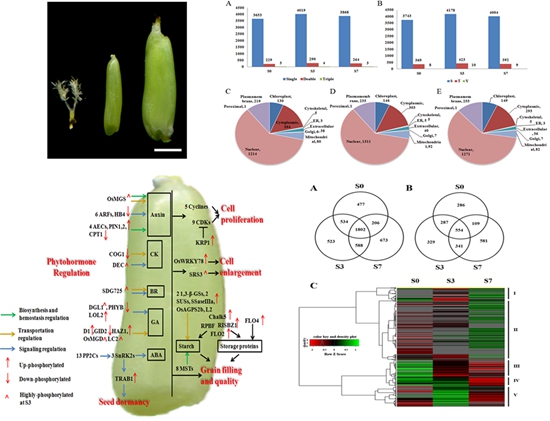 Recently, rice reproductive biology team led by Dr. Jian Zhang on China National Rice Research Institute (CNRRI) of Chinese Academy of Agricultural Sciences (CAAS) reported the largest scale identification of the sites, intensities and dynamics of phosphoproteins from rice developing seeds by employing a MOAC phosphopeptide enrichment method associated with LC-MS/MS identification. In total, 2529, 2706 and 2709 phosphoproteins from rice pistils, seeds at 3 DAP (Day After Pollination) and 7 DAP were discovered respectively, including 2487 phosphoproteins showed a DP (differentially phosphorylated) pattern. Some of the DP proteins are master regulators of various biological processes such as phytohormone biosynthesis and signaling, cell proliferation and enlargement, grain filling and quality control, indicating protein phosphorylation/dephosphorylation is a key switch turning on/off protein functions. The research provided one of the largest dataset of rice protein phosphorylation, but also shed novel lights into the molecular mechanisms regulating rice seed development.