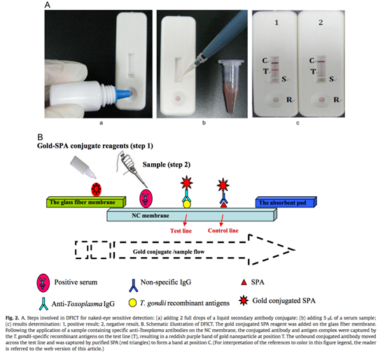 Recently, Dr. Jiang Wei and Dr. Wang Quan in Shanghai Veterinary Research Institute (SVRI) of CAAS, reported a novel dynamic flow immunochromatographic test using gold nanoparticles for the serological detection of Toxoplasma gondii infection in dogs and cats. Toxoplasmosis is a worldwide endemic disease caused by T. gondii, a parasite that infects a broad spectrum of vertebrate hosts, including humans. The immunochromatographic test (ICT) has become a well-established and accepted point-of-care testing technique. However, considerable efforts still need to be made to improve ICT in the areas of manufacturing processes, sample volume requirements and production costs.