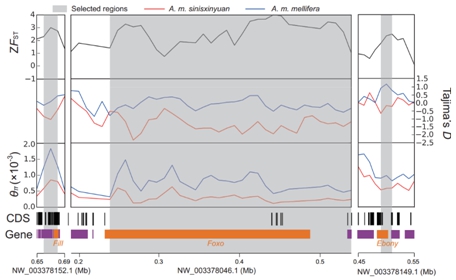 Fig. 3 Examples of genes with strong selective sweep signals in A. m. sinisxinyuan and A. m. mellifera.