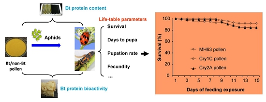 Recently, researchers at State Key Laboratory for Biology of Plant Diseases and Insect Pests, Institute of Plant Protection of CAAS, developed a sound dietary-exposure assay for assessing the potential effects of transgenic plant pollen or insecticidal compounds on a ladybird beetle, Propylea japonica. Using the dietary assay, the potential risk of Bt rice pollen containing Cry1C or Cry2A to this predatory species were critically assessed. The results have been published on online in Scientific Reports on January 8, 2015.