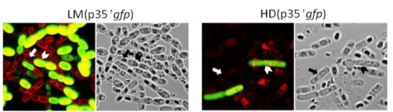 In this study, we describe a Bt strain LM1212 that presents the unique ability to terminally differentiate into crystal producers and spore formers. Transcriptional analysis based on lacZ and gfp reporter genes suggested that this phenotype is the consequence of a new type of cell differentiation associated with a novel regulation mode of cry gene expression. The differentiating crystal-producer phenotype has higher spore productivity than a typical Bt strain and is better able to compete with Cry toxin null ‘cheaters’. Potentially, this division of labour provides additional fitness benefits in terms of spore viability or durability of Cry toxin.