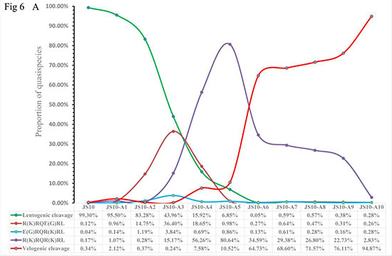 Phylogenetic analysis of NDV evolution showed that velogenic viruses likely emerged from a lentogenic progenitor virus via change two amino acids at the F0 cleavage site. The researchers passaged an avirulent isolate JS10 through chicken air sac and embryos, and the pathogenicity of the variants was assessed. A virulent variant, JS10-A10, was generated from consecutive passage in air sacs. And they developed a deep sequencing approach to detect of low-frequency viral variants across the NDV genome and observed that virulence enhancement of JS10 was due to the selective accumulation of velogenic quasispecies and the concomitant disappearance of lentogenic quasispecies. Their results suggest that because it is difficult to avoid contact between natural waterfowl reservoirs and sensitive poultry operations, circulating lentogenic NDV strains may represent a potential reservoir for emergent velogenic NDV strains that could cause outbreaks in chickens.