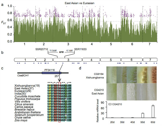 Fig. 2: identification of a key mutation responsible for the accumulation of β-carotene in the fruit of the Xishuangbanna cucumbers.
