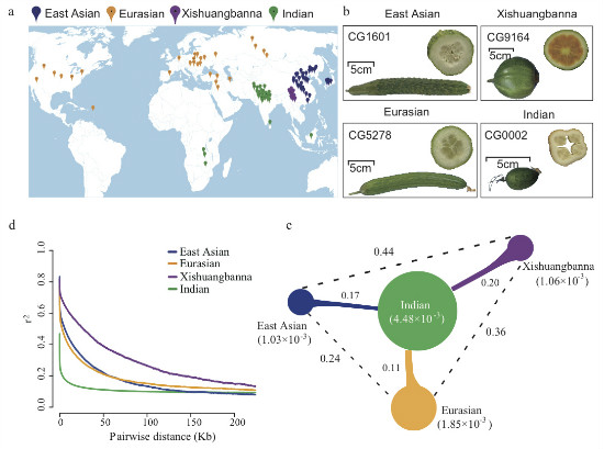 A total of 3,305,010 single nucleotide changes, and 336,081 insertions or deletions of up to five nucleotides in length were captured in the genomes of the population. Analyses of these variants revealed one ancestral, wild group and three derived, cultivated groups. Comparison of the genomes of the wild and cultivated cucumbers identified 112 genome regions (containing about 2,000 genes) putatively under human selection that lead to the genetic variations of today’s cucumber varieties, including the genetic region that made the ancient cucumber extremely bitter.