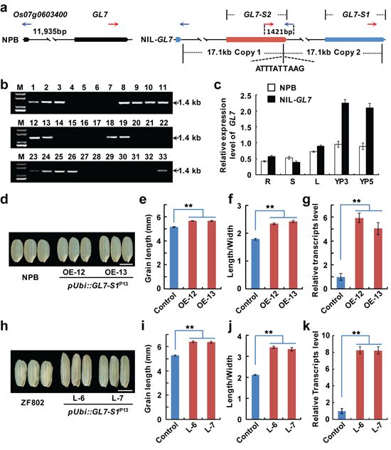 Compare to ordinary short grain varieties, the long grain American japonica rice has a slender and translucent appearance. Researchers cloned GL7 through a map-based cloning approach and finally narrowed the locus to an interval of 20.4 kb, which con-tains two candidate genes. GL7 encodes a protein homologous to Arabidopsis thaliana LONGIFOLIA proteins, which regulate longitudinal cell elongation. Further analysis found a 17.1-kb tandem duplication containing GL7 in long grain American japonica rice varieties. Tandem duplication of a 17.1-kb segment at the GL7 locus leads to upregulation of GL7 and downregulation of its nearby negative regulator, resulting in an increase of grain length and decrease of chalkiness, thus greatly improve grain appearance quality.