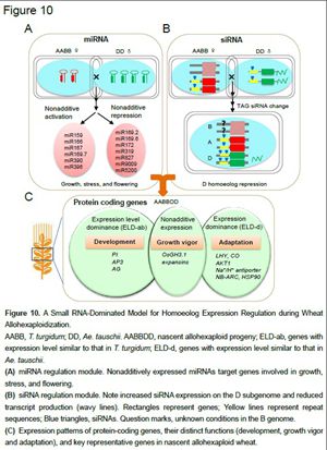 The team also found that a high proportion of microRNAs were nonadditively expressed upon polyploidization, potentially leading to differential expression of important target genes involved in growth, flowering, and environmental adaptation. Furthermore, increased small interfering RNA density was observed for transposable element–associated D homoeologs in the allohexaploid progeny, which may account for biased repression of D homoeologs. Together, these data provide insights into small RNA–mediated dynamic homoeolog regulation mechanisms that may contribute to heterosis in nascent hexaploid wheat. These findings broadened our understanding on the mechanism of heterosis in crops.