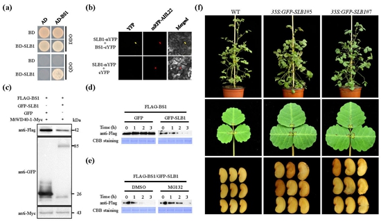 Organ size is a major agronomic trait that determines grain yield and biomass production in crops. However, the molecular mechanisms controlling organ size, especially in legumes, are poorly understood. Using forward genetic approaches in a Tnt1 insertion mutant population of the model legume Medicago truncatula , we identified SMALL LEAF AND BUSHY1 ( SLB1 ), which is required for the control of organ size and lateral branching. Loss of function of SLB1 led to reduced leaf and flower size but increased lateral branch formation in M. truncatula . SLB1 encodes an F-box protein, an ortholog of Arabidopsis thaliana STERILE APETALA (SAP), that forms part of an SKP1/Cullin/F-box E3 ubiquitin ligase complex. Biochemical and genetic analyses revealed that SLB1 controls M. truncatula organ growth and lateral branching by modulating the stability of BIG SEED1 (BS1). Moreover, the overexpression of SLB1 increased seed and leaf size in both M. truncatula and soybean ( Glycine max ), indicating functional conservation. Our findings reveal a novel mechanism by which SLB1 targets BS1 for degradation to regulate M. truncatula organ size and shoot branching, providing a new genetic tool for increasing seed yield and biomass production in crop and forage legumes.
