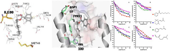 In this paper, the authors first briefly proposed that controlling the adult is a simple and effective way because of grub’s variety and covert behavior. And then, the paper emphasized that understanding the molecular mechanism for plant host recognition mediated by olfaction would help in developing new strategies for the control of H. oblita. Based on the previous research, homology modeling of HoblOBP1 has been conducted and the three-dimensional structure of HoblOBP1 contains six α-helices and three disulphide bridges that connect the helices, and the hydrophobic pockets are both composed of five helices. The results of molecular docking with hexyl benzoate showed that van der Waals interactions and hydrophobic interactions are both important in the bonding. Intramolecular residues formed the hydrogen bonds in the C terminus of the protein and the bonds are crucial for the ligand-binding specificity. MET48, ILE80 and TYR111 are the predicted binding sites for HoblOBP1. Site-directed mutagenesis and fluorescence assay demonstrated that ligands could not be recognized by mutant of Tyr111. A possible explanation is that the compound could not be recognized by the mutant, and remains in the binding cavity because of the loss of the intramolecular hydrogen bonding that acts as a holder. So the authors believe that Tyr111 of HoblOBP1 is a key binding site. They also believe that Ile80A is a very important binding site, especially to some ligands.
