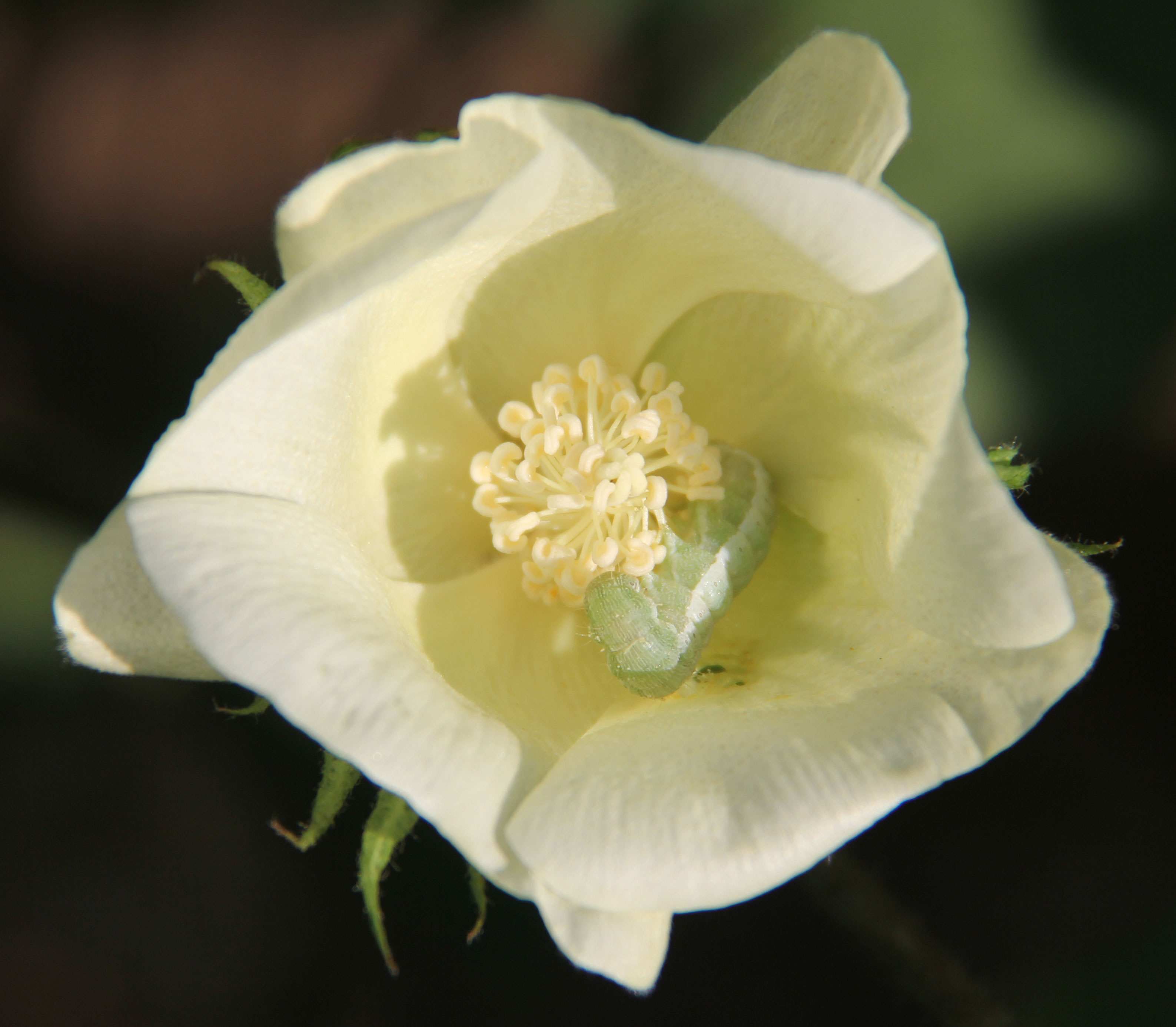 Cotton bollworm caterpillar feeding on a flowering cotton plant