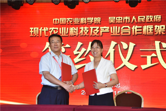 会上,李金祥和苏慧娟代表双方签署了《中国农业科学院—吴忠市人民政府现代农业科技及产业合作框架协议》,双方将围绕优质粮食、草畜、蔬菜、葡萄、枸杞及中药材等特色产业发展的关键技术问题开展协同攻关,加强吴忠农业技术人才培养,支持农业重大关键技术合作研发和成果转化,加快推进吴忠农业现代化进程和乡村振兴。