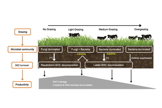放牧是草原生物多样性和生产力的主要调节因素,这种调节作用主要通过“自上而下”(植物→土壤→微生物)再“自下而上”(微生物→土壤→植物)的影响作用形成。放牧会显著影响草地土壤微生物群落。然而,放牧对地下的菌群组成和代谢过程的影响及对土壤生产力的驱动机制还缺乏较全面的研究。该研究利用长期封闭的草甸草原进行不同强度的放牧观测试验,揭示了不同放牧强度对草地土壤微生物群落组成和活性的影响,进而驱动土壤有机碳周转和土壤生产力变化,阐明了微生物群落对土壤生产力的驱动机制。