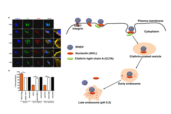 该研究发现宿主蛋白核仁素在病毒感染细胞的内化过程中起关键作用。研究人员发现宿主蛋白核仁素能够与该病毒的衣壳蛋白特异性结合,同时发现网格蛋白依赖的内吞作用同样参与了该病毒的内化过程,此外还发现宿主蛋白核仁素通过与网格蛋白轻链特异性结合从而在网格蛋白依赖的内吞作用中发挥重要作用。这些研究表明宿主蛋白核仁素通过网格蛋白依赖的内吞作用介导病毒的内化过程。该研究成果为研究杯状病毒科其他成员的感染机制提供了新的依据,同时对更好地控制该病毒对养兔业的危害起到了指导作用。