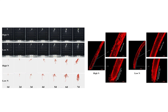 团队研究人员评估了缺氮条件油菜根系的动态变化,研究发现缺氮条件下油菜主根和侧根均显著变长、根系变软、根尖分生区细胞数增加且伸长区细胞增大,表明缺氮胁迫下根系的生长可能是由细胞分裂和扩增的刺激引起。