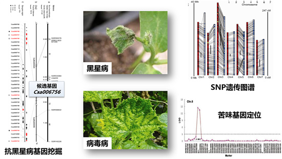 2.构建了首张栽培黄瓜高密度遗传图谱,创建了国际领先的分子标记多基因聚合育种技术,选择效率提高5倍以上。利用黄瓜基因组大数据,构建了国际上第一张超饱和含有10629个SNP的遗传图谱;首次发现了果实苦味基因Bi-3和显性果皮有光泽基因G,阐明了有光泽、抗黑星病、抗病毒病等性状的遗传规律;开发出与无苦味、有光泽、抗黑星病、抗病毒病等21个性状紧密连锁的分子标记。
