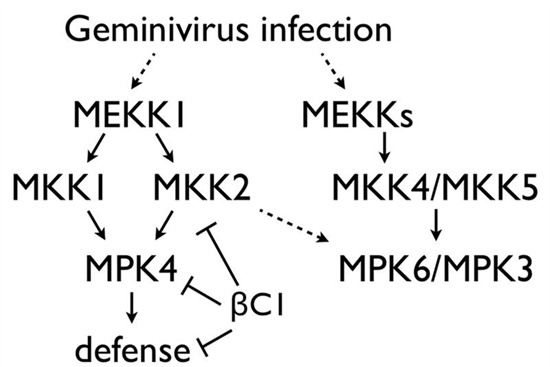 据悉,双生病毒是一类在世界范围内广泛发生并对作物产量造成严重损失的单链DNA病毒。卫星DNAβ是与双生病毒相伴随并能够诱导病害症状的单链环状DNA分子,其编码的βC1蛋白能够从多个方面干扰植物的生长与防御过程,在病毒诱导症状与介体传播中起到重要作用。同时,植物中存在一种丝/苏氨酸蛋白激酶MAPK,其所形成的级联途径可将外界刺激信号传入细胞内,使植物细胞及时对双生病毒产生防御反应。