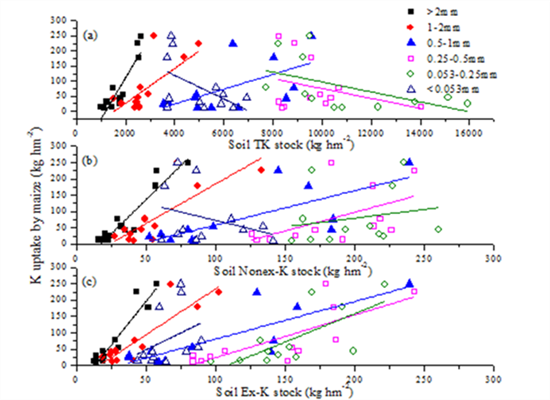 该研究基于红壤长期施肥定位试验,通过选取不施肥对照、施氮磷肥、施氮磷钾肥和氮磷钾配施猪粪处理,分析了不同处理土壤的团聚体组分中全钾、交换性钾和非交换钾的含量和储量变化,并构建了团聚体组分中钾素储量与作物吸钾量的量化关系。结果表明:长期施用钾肥可以显著增加红壤旱地团聚体中交换性钾和非交换性钾的储量;且氮磷钾配施猪粪处理主要是由于较高的碳输入进而提升了红壤旱地团聚体钾素储量;进一步分析发现,大于2毫米团聚体组分中钾素是影响作物吸钾量的关键。
