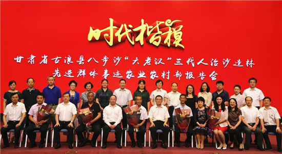 甘肃省古浪县八步沙林场是由郭朝明、贺发林、石满等6位农民,在1981年以联户承包形式组建的集体林场。38年来,以“六老汉”为代表的三代治沙人,挺进荒漠治沙造林,完成治沙造林21.7万亩,管护封沙育林草面积37.6万亩,以愚公移山精神生动书写了从“沙逼人退”到“人进沙退”的绿色篇章,为生态环境治理作出了重要贡献,铸就了勇挑重任、护卫家园的担当精神,不畏艰难、实干苦干的拼搏精神,勇于探索、唯实创新的进取精神,矢志坚守、接续奋斗的愚公精神,中共中央宣传部授予其“时代楷模”荣誉称号。报告会上,郭万刚、贺中强、郭玺、陈树君、袁洁等5位同志从不同角度讲述了治沙造林的奋斗历程和感人事迹。
