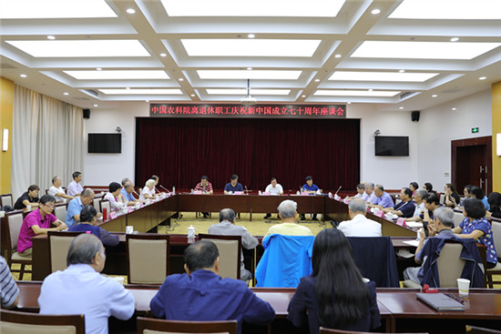 近日,中国农业科学院召开离退休职工庆祝新中国成立70周年座谈会,共话70年沧桑巨变,共祝新中国70华诞。院党组成员、纪检组组长李杰人,院党组成员、人事局局长贾广东,院机关、京区各单位老同志代表、离退休职工党支部书记和离退休工作人员60余人参加会议。