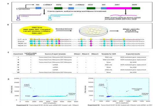 1.创建新型CRISPR/Cas介导的农作物等位基因替换技术体系。作物科学研究所夏兰琴研究团队联合美国加州大学圣地亚哥分校在国际上首次建立了CISPR/Cas介导、分别以DNA和RNA转录本作为修复模板的农作物等位基因替换体系,突破了基因片段替换的技术瓶颈,实现了水稻OsALS等位基因片段精准替换,获得无转基因抗除草剂水稻,相关研究结果发表于国际著名生物技术期刊《自然·生物技术(Nature Biotechnology)》。