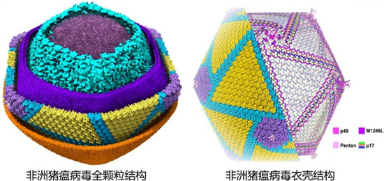 4.解析非洲猪瘟病毒结构及装配机制。哈尔滨兽医研究所步志高研究团队联合中国科学院生物物理研究所首次全面解析了非洲猪瘟病毒全颗粒的三维精细结构,该病毒是目前世界上解析近原子分辨率结构的最大病毒颗粒,为揭示非洲猪瘟病毒入侵宿主细胞以及逃避和对抗宿主抗病毒免疫的机制提供了重要线索。
