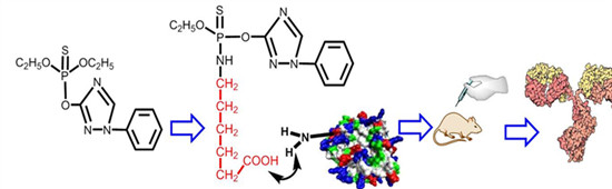 当前,酶联免疫分析试剂盒、胶体金试纸条和化学发光试剂盒已经成为某些成分分析的重要技术手段,在医院、体检中心甚至在家中,大家都可以享受到基于大分子检测的便捷、快速的健康诊断产品。然而,农产品的样品基质复杂,农药残留量极低,分子量小,核心生物识别材料制备困难,检测灵敏度不高。在很长一段时间内,上述技术瓶颈一直制约了农产品中农药残留快速检测技术的应用和发展。针对这些问题,团队和北京勤邦生物技术有限公司通力合作,从农药核心抗体制备技术出发,发明了基于亲脂性与半抗原链臂长度互作的半抗原结构设计技术,克服了传统半抗原分子结构凭经验设计的技术瓶颈,揭示了抗体筛选体系中引入样品基质对提高抗体抗干扰能力的重要性,成功制备了对硫磷、毒死蜱、克百威、三唑磷等亲和性好、抗干扰能力强的44个化学污染物抗体,为实现快速检测提供了核心材料。