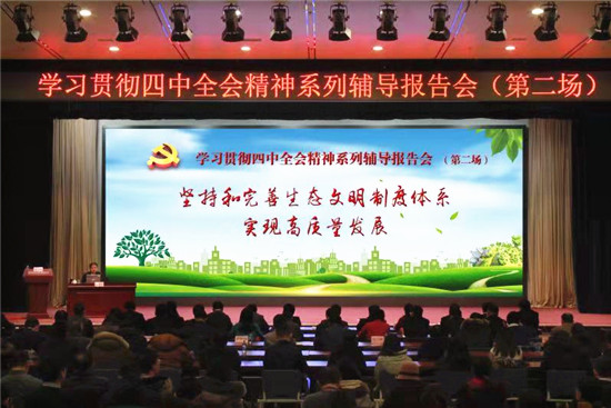 1月14日,中国农业科学院举办学习贯彻党的十九届四中全会精神辅导报告会,邀请中央党校赵建军教授以“坚持和完善生态文明制度体系实现高质量发展”为题作报告。院党组副书记、副院长吴孔明主持报告会。