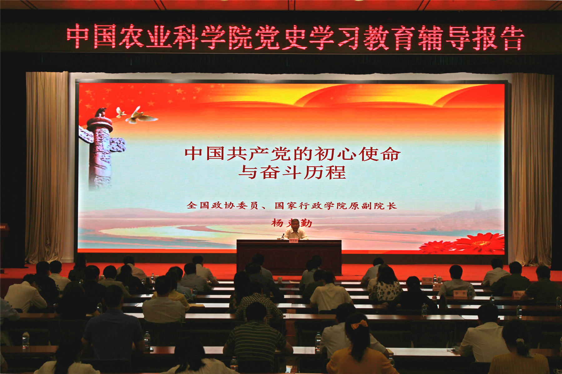 5月21日,中国农业科学院举办党史学习教育辅导报告。活动邀请全国政协委员、国家行政学院原副院长杨克勤作了题为“中国共产党的初心使命与奋斗历程”的辅导报告。院党组副书记、副院长吴孔明主持会议。院纪检组组长李杰人,副院长刘现武,院党组成员、人事局局长陈华宁参加会议。